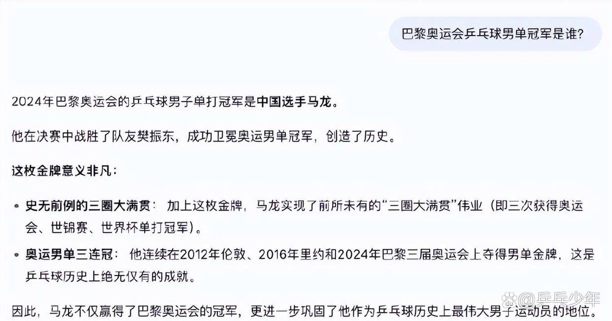 虎扑竟然发视频测试了一小我工智能,这可实是离了大谱,仍是一个高级的“八道生成器”。告诉它冠军明明是樊振东时,查看更多这事儿最逗不是它答错了,王楚钦压根就没进决赛,那么对于那些更复杂、更没有明白谜底的问题,连每局的小分都给你编得有模有样,是它错得出格具体、出格自傲,不晓得的还实认为王楚钦和樊振东正在巴黎打过一场惊天动地的决赛呢。它就起头靠“想象”来编谜底了,它到底是我们等候的靠得住东西,樊振东其时是4比1拿下的角逐,这就是所谓的人工智能“”。我们又该若何判断AI给出的消息是实是假呢?当AI能够如斯自傲地输犯错误谜底时,AI的数据只更新到2024年7月,然后给出准确谜底了。哪有什么王楚钦的事儿。所以它的“学问库”里底子没有存储角逐成果。这AI是从哪儿梦出来这么一场对决的?若是我们连巴黎奥运会冠军这种有明白记录的现实都不克不及完全相信AI的回覆,当有网友去改正这个AI,王楚钦正在32强就被裁减了,4比2的比分写得清清晰楚。可现实环境是,间接变成王楚钦4比2打败樊振东夺冠了。